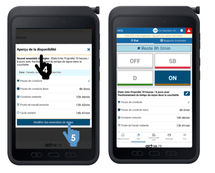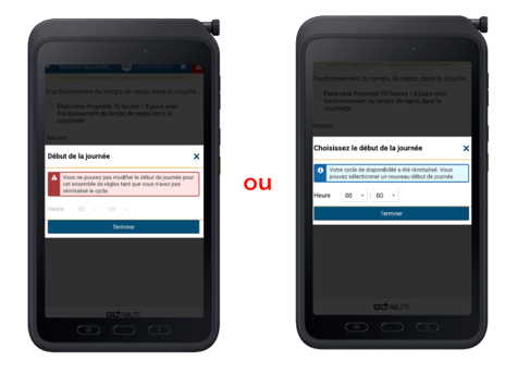 ** À noter que dans le cas où un chauffeur passe du cycle Américain au cycle Canadien, il aura d'abord un avis qu'il ne lui est pas possible de modifier son début de journée avant de voir apparaître ses disponibilités **