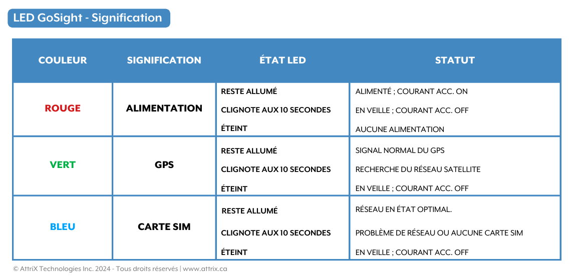 Débutez en éteignant l'ignition et attendez environ 10 minutes, en vous assurant que l'appareil n'affiche aucun voyant lumineux actif. Puis, activez l'ignition et attendez une minute pour observer si l'appareil s'active ou se lance correctement. Un démarrage adéquat se manifeste habituellement par un voyant bleu et un voyant rouge constants, une LED verte clignotante et un bip sonore. Si, une fois l'ignition mise depuis plus de 60 secondes, vous constatez que la LED rouge commence à clignoter, cela peut signifier que l'appareil est sur le point de s'éteindre. Dans cette éventualité, il est conseillé de vérifier les connexions électriques de votre appareil, comme s'assurer que le câble de la banque d'alimentation est correctement branché à celui de la GoSight. Dans le cas où l'appareil ne s'active pas du tout, il est également prudent de vérifier les fusibles pour identifier toute défaillance potentielle.